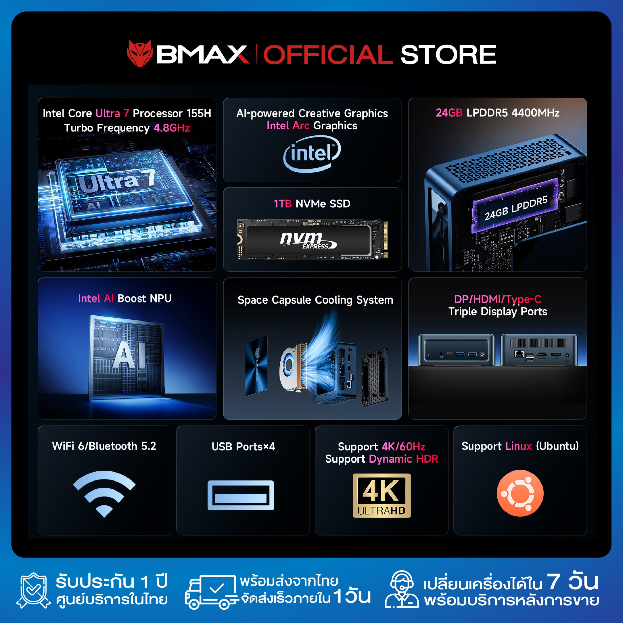 BMAX B11 Power Mini PC มินิพีซี intel Ultra 7 155H Ai Power Cpu RAM 24GB DDR5 + SSD 1TB รับประกัน 1 ปีในไทย